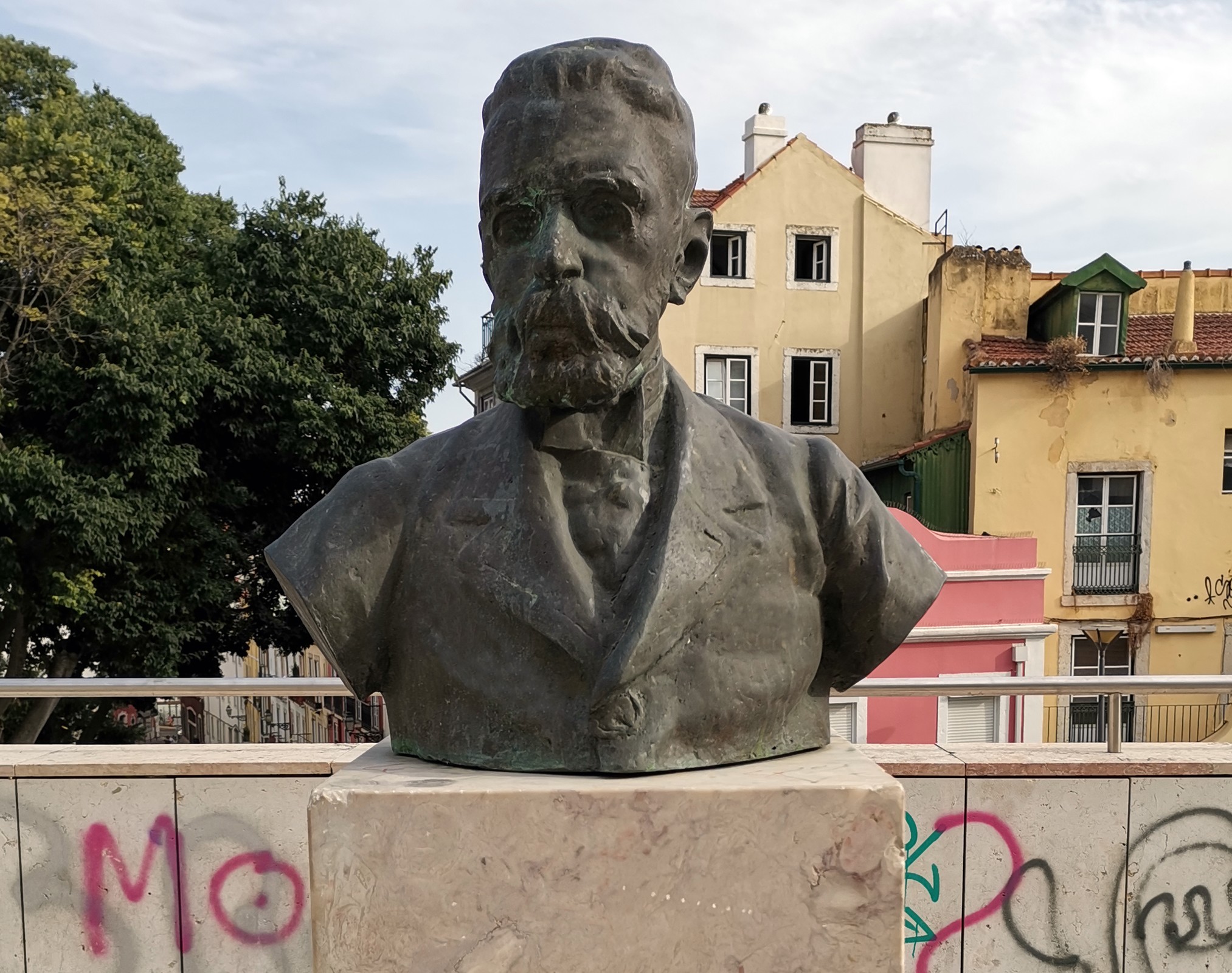 Machado de Assis (1839-1908), natural do Rio de Janeiro, foi poeta, romancista, dramaturgo, contista, jornalista e teatrólogo, sendo considerado como o maior nome da literatura brasileira. O monumento em sua homenagem, composto por busto em bronze assente sobre pedestal em pedra mármore, foi oferecido pela cidade do Rio de Janeiro à cidade de Lisboa, por ocasião do centenário da morte do escritor. Executado em 2008, foi inaugurado no Largo de Jesus, junto à Igreja/Convento de Jesus, em 16 de maio de 2009.