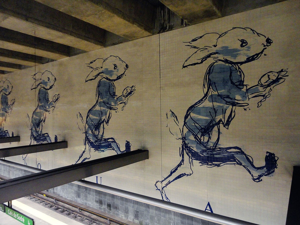 Grandes painéis de azulejos representando um coelho apressado, que evoca uma das personagens do clássico da literatura universal “Alice no País das Maravilhas”, de Lewis Carroll, podem ser observados no cais da estação, enquanto uma superfície curva de azulejos azuis, por onde, pontualmente, correm lençóis de água, é visível sob as escadas de acesso ao exterior.