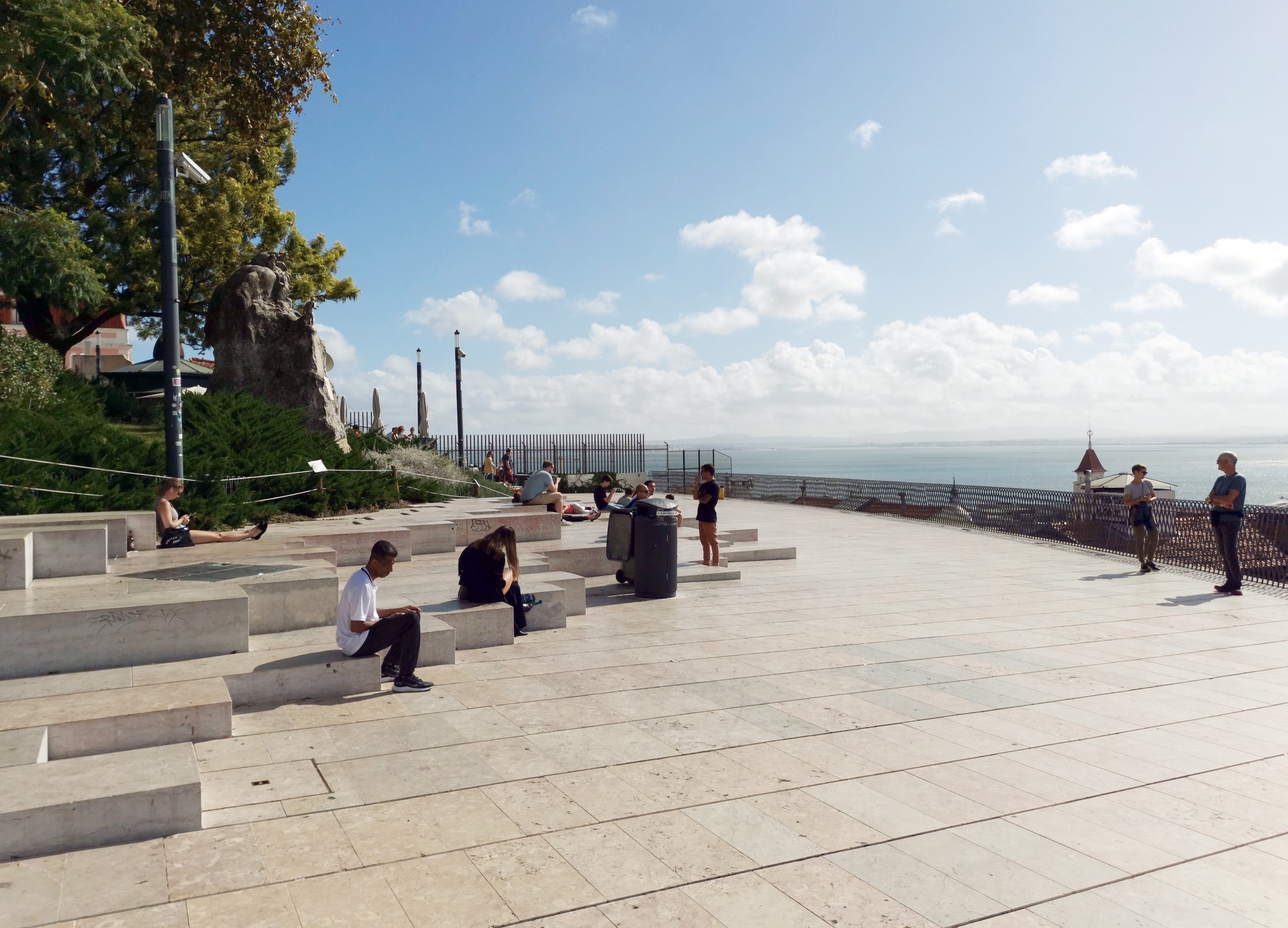 A partir deste miradouro podemos observar o Tejo, os telhados da freguesia de São Paulo e para ocidente os bairros da Lapa e da Madragoa, noutra época local de pescadores e varinas. Trata-se de um espaço com vegetação escassa, dominado pela enorme estátua do Adamastor, figura monstruosa imaginada por Camões e descrita em “Os Lusíadas”, símbolo do Cabo das Tormentas, que vociferava ameaças aos navegadores que por ali passassem.