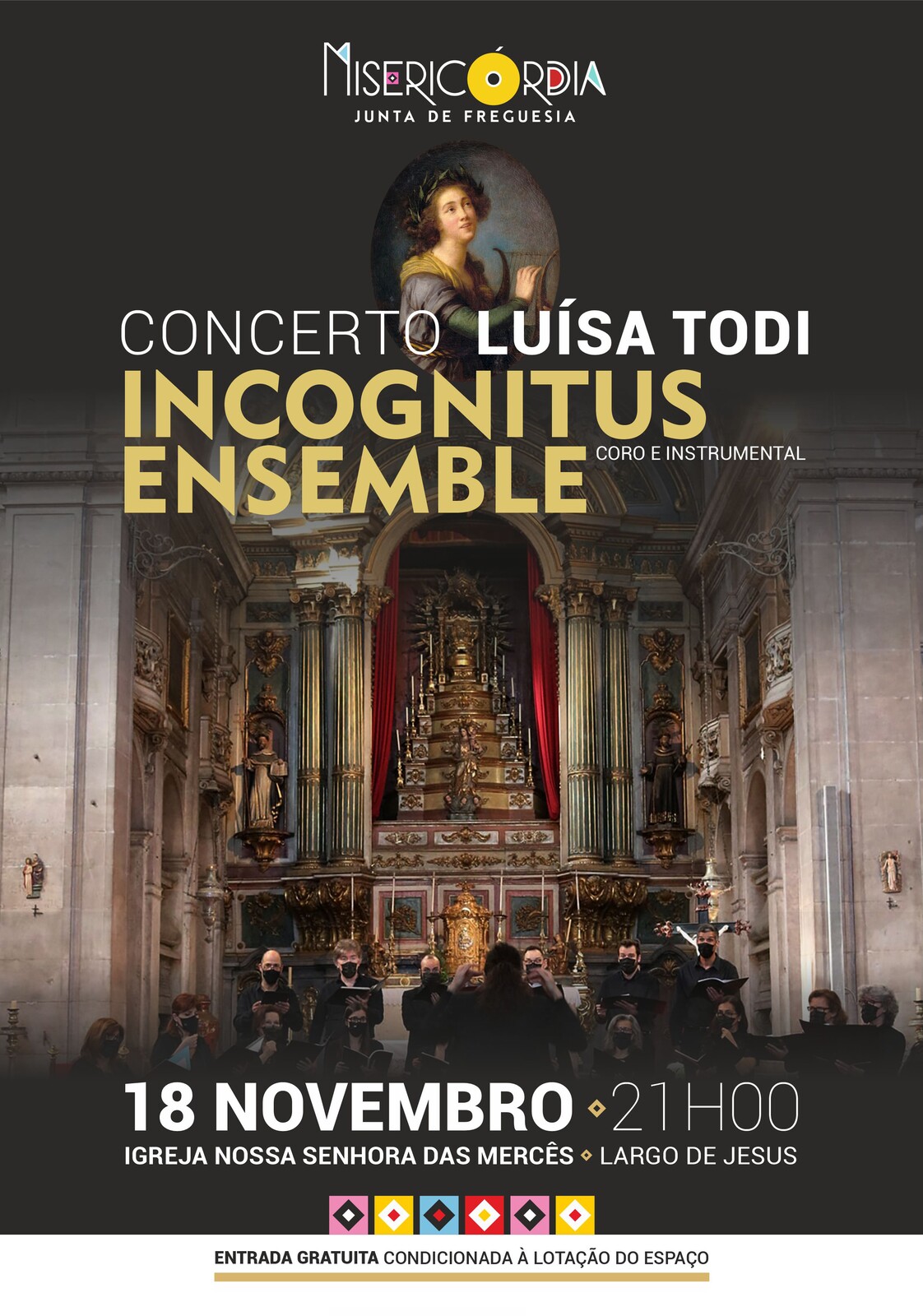 Inserido nas comemorações dos 270 anos do nascimento de Luísa Todi, a Junta de Freguesia da Misericórdia promove no próximo dia 18 de novembro, na Igreja Nossa Senhora das Mercês, o Concerto Luísa Todi - Incognitus Ensemble, numa homenagem à meio-soprano portuguesa mais célebre de todos os tempos.
