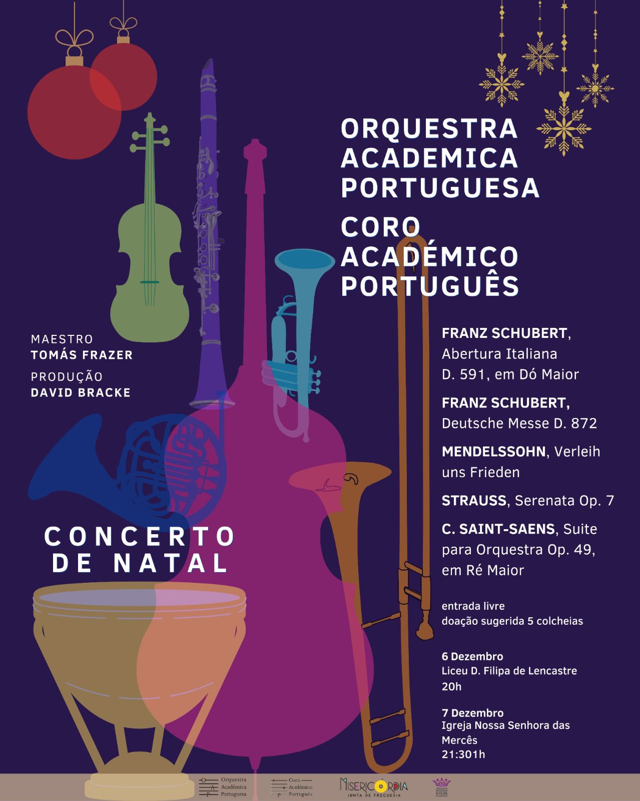 A partir das 21h30, sob a batuta do Maestro Tomás Frazer, a Orquestra Académica Portuguesa traz-nos peças de Franz Schubert, Mendelssohn e Strauss, numa produção de David Bracke, em mais um Concerto de Natal da Junta de Freguesia da Misericórdia.