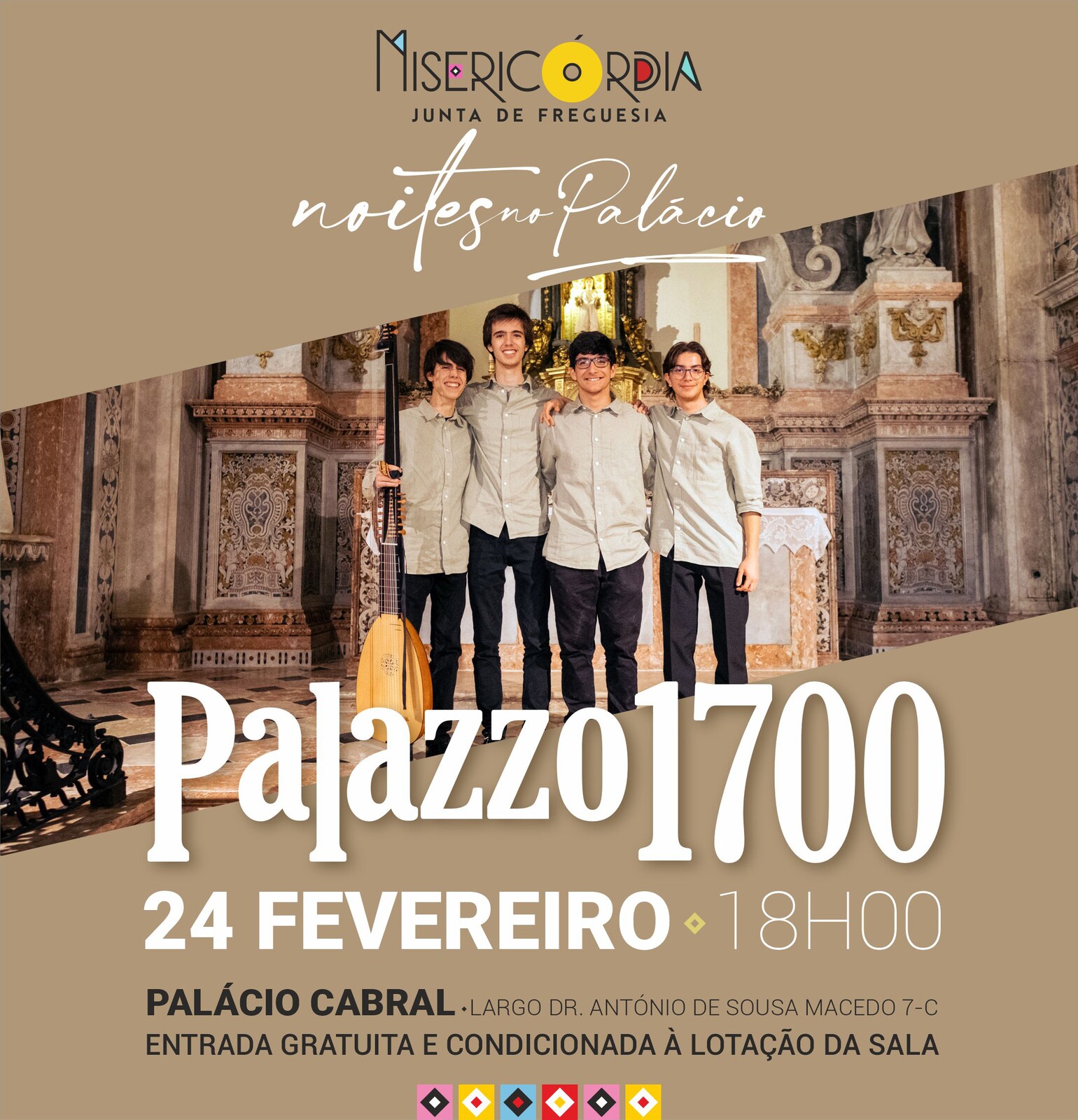 O ‘Palazzo 1700’ é constituído por dois violinos (Júlio Cortez Marques e Salvador Bastos), um contrabaixo (Eduardo Alcântara) e um arquialaúde/guitarra barroca (Vicente Morgado), juntos para um espetáculo a não perder no Palácio Cabral, no Largo António de Sousa Macedo 7-C.