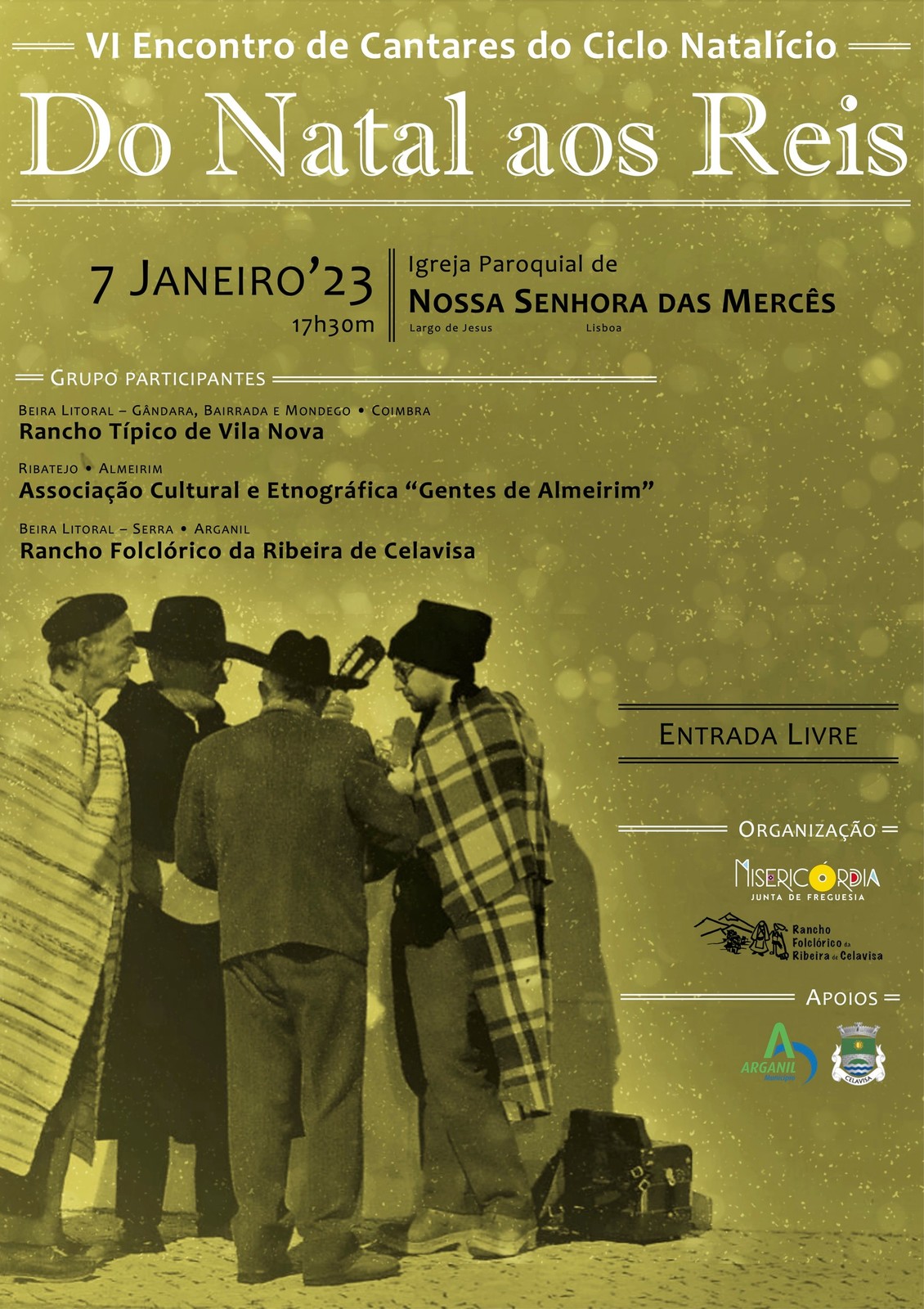 Este encontro de cantares tradicionais da época, terá como palco a Igreja Paroquial de Nossa Senhora das Mercês, no Largo de Jesus e conta com a participação do Rancho Folclórico da Ribeira de Celavisa, do Rancho Típico de Vila Nova e da Associação Cultural e Etnográfica ‘Gentes de Almeirim’.