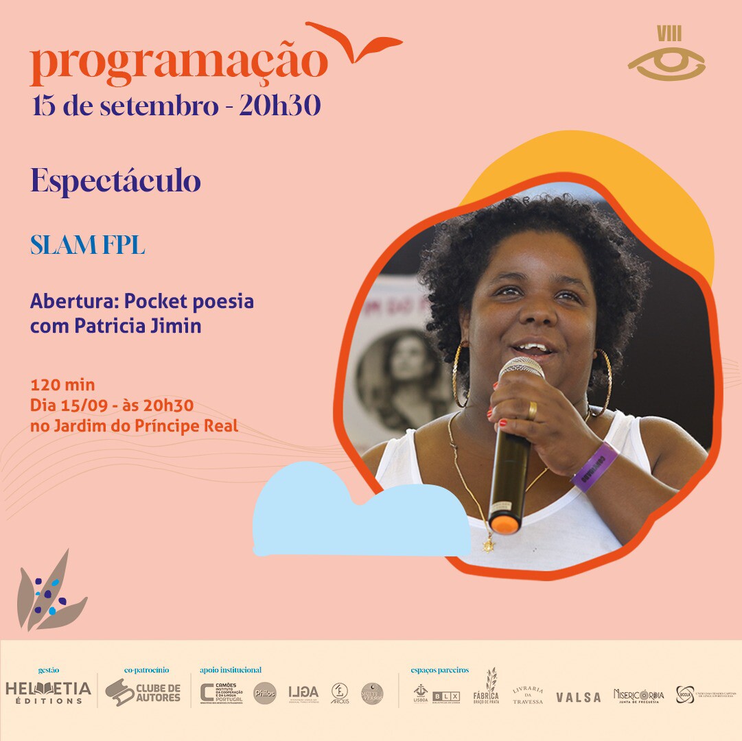 Com o apoio da Junta de Freguesia da Misericórdia e inserido no programa do Festival, no dia 15 de setembro, no Príncipe Real e a partir das 20h30, Patrícia Jimi, poeta, produtora cultural, ‘slammer’, romancista e compositora é convidada para abrir a primeira edição do ‘Slam’ do Festival de Poesia de Lisboa, com uma sessão de ‘pocket poesia’.