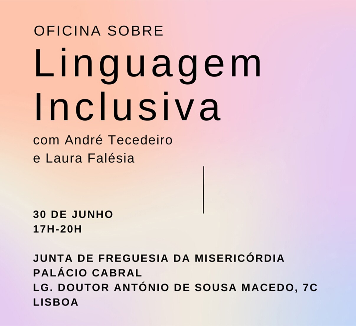 A Junta de Freguesia da Misericórdia promove, no próximo dia 30 de junho, no Palácio Cabral, 7-C, entre as 17h00 e as 20h00, uma ‘Oficina de Linguagem Inclusiva’.
