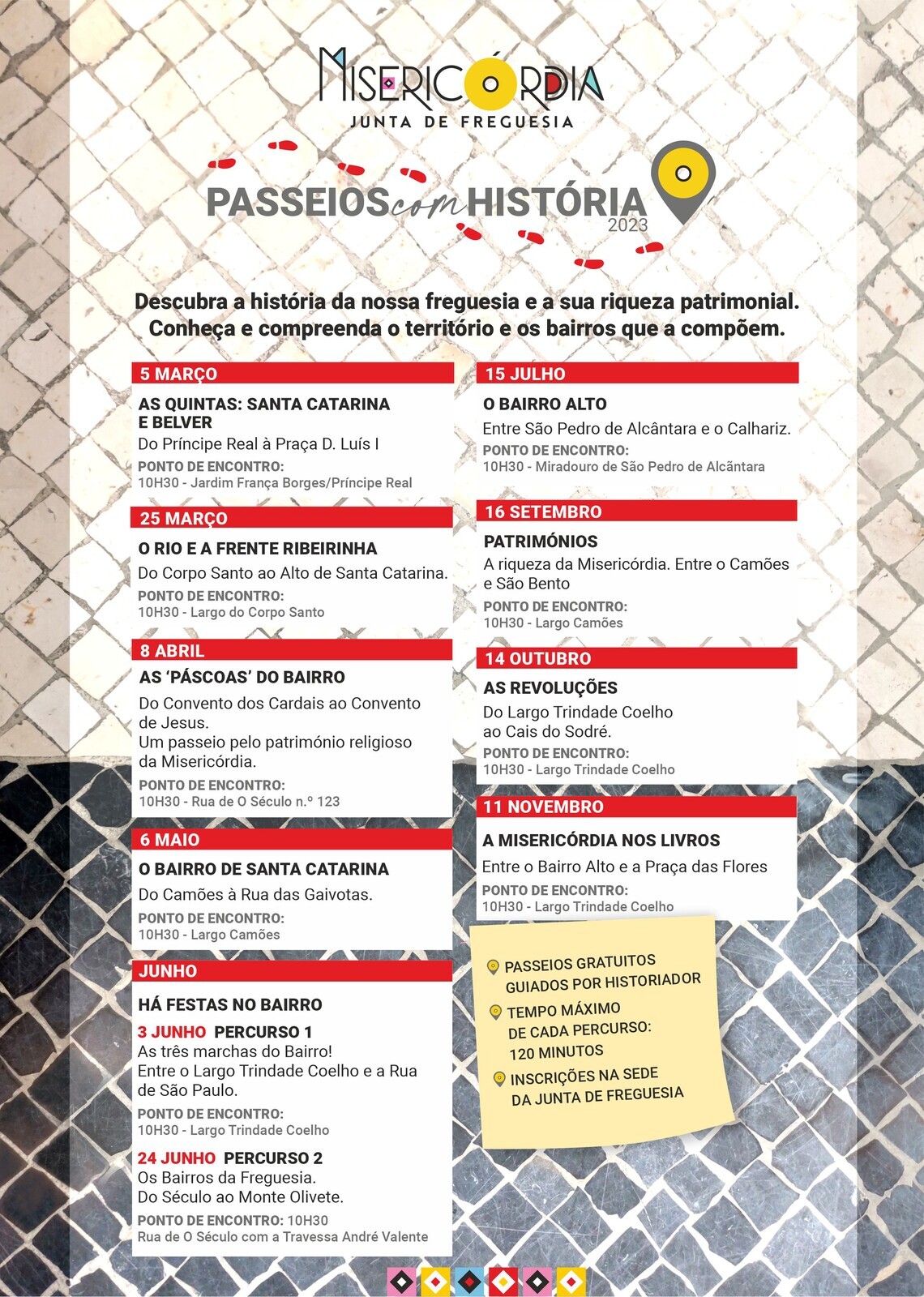 Até 10 de novembro de 2023, a Junta de Freguesia da Misericórdia promove visitas guiadas pelo nosso território. Descobrir a história da nossa freguesia e a sua riqueza patrimonial, conhecer e compreender os espaços e os bairros que compõem a Misericórdia é o desafio para estes ‘Passeios com História’.