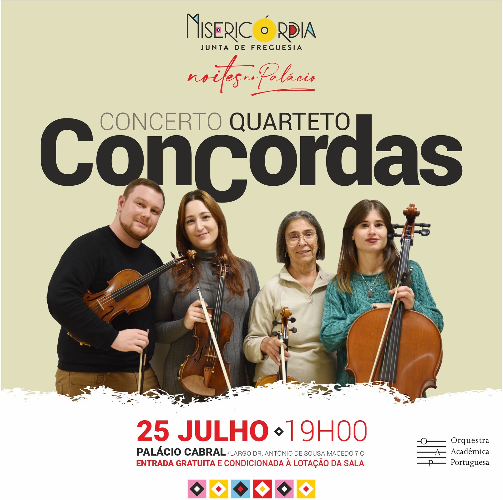 O Quarteto ‘ConCordas’, um dos grupos de câmara da Orquestra Académica Portuguesa/ Coro Académico Português, apresenta-se no próximo dia 25 de julho a partir das 19 horas, no Palácio Cabral para mais um concerto ‘intimista’, inserido na programação de verão das ‘Noites no Palácio’.