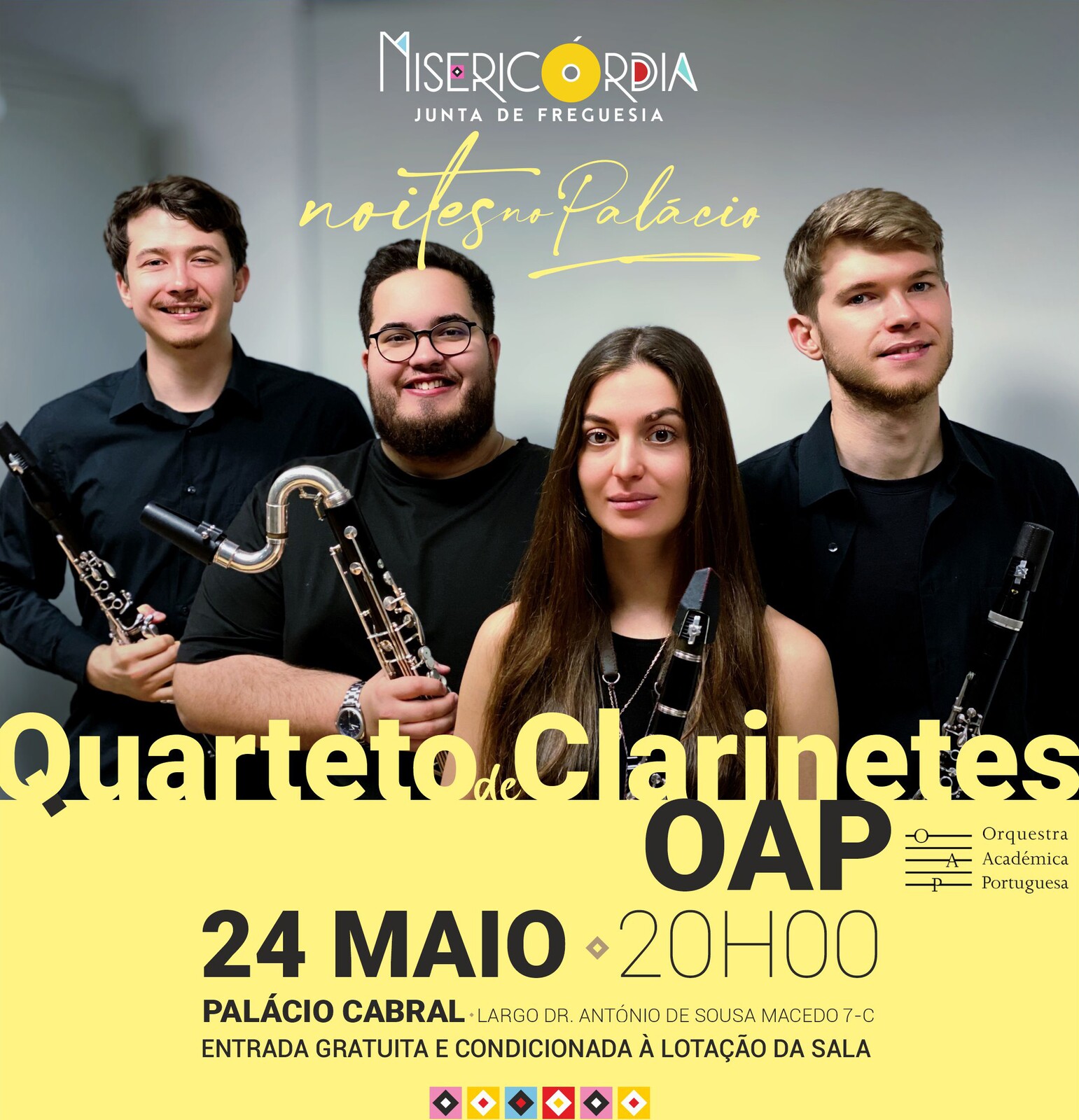 Em noite dedicada aos instrumentalistas de sopros, convidamos o ‘Quarteto de Clarinetes da Orquestra Académica Portuguesa, que nos vão trazer esse som claro e límpido que dá mais expressividade à música, em mais um espetáculo a não perder no Palácio Cabral, no Largo António de Sousa Macedo 7-C.