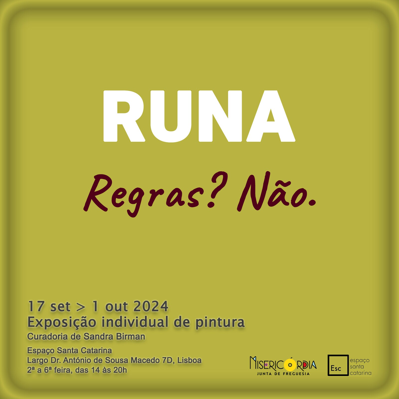 Em ‘Regras? Não.’, RUNA convida-nos a explorar um universo onde a criatividade flui sem barreiras, através das pinturas de grande formato, onde encontramos um diálogo interativo entre o concreto e o imaginário, onde a sugestão de figuras coexiste com composições abstratas.