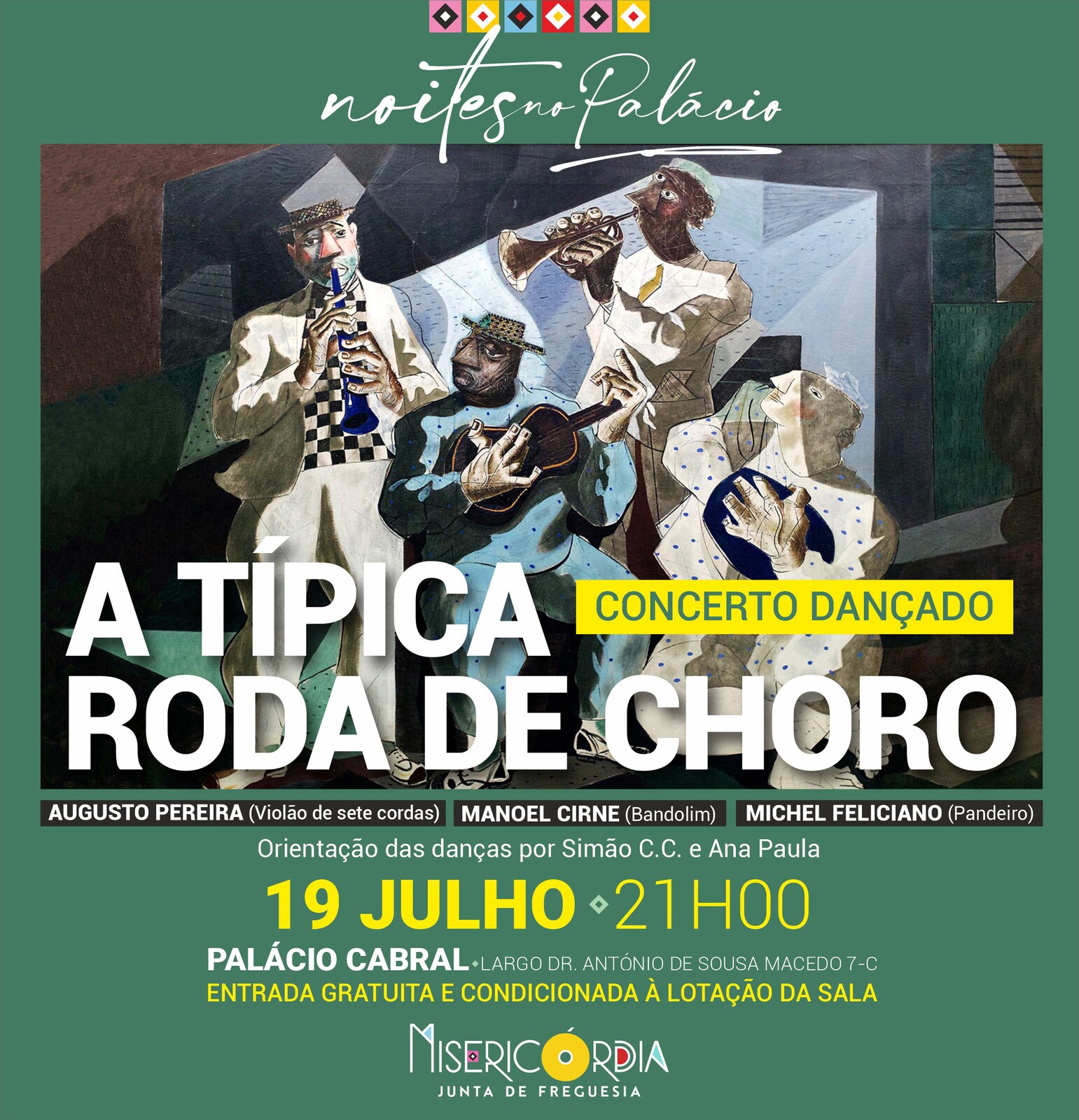 Em noite dedicada ao ‘Choro’ ou ‘Chorinho brasileiro’ convidamos o grupo ‘A típica roda de choro’, composto pelos músicos Augusto Pereira (violão de sete cordas), Manoel Cirne (bandolim) e Michel Feliciano (pandeiro), para este concerto dançado a não perder no Palácio Cabral, no Largo António de Sousa Macedo 7-C. A orientação das danças estará a cargo de Simão C.C. e Ana Paula.