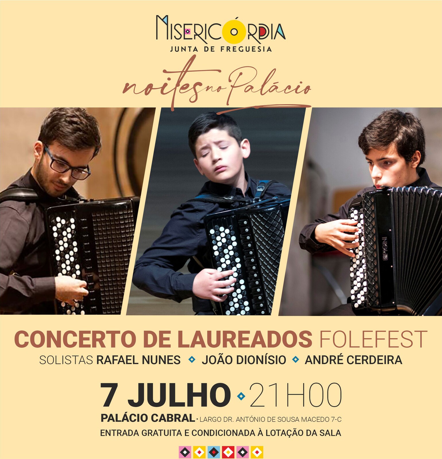 As ‘Noites no Palácio’ regressam com o melhor que o acordeão erudito nos pode proporcionar. André Cerdeira, João Dionísio e Rafael Nunes, músicos de enorme qualidade artística e laureados do concurso ‘Folefest 2023’ estreiam a temporada de verão no Palácio Cabral.