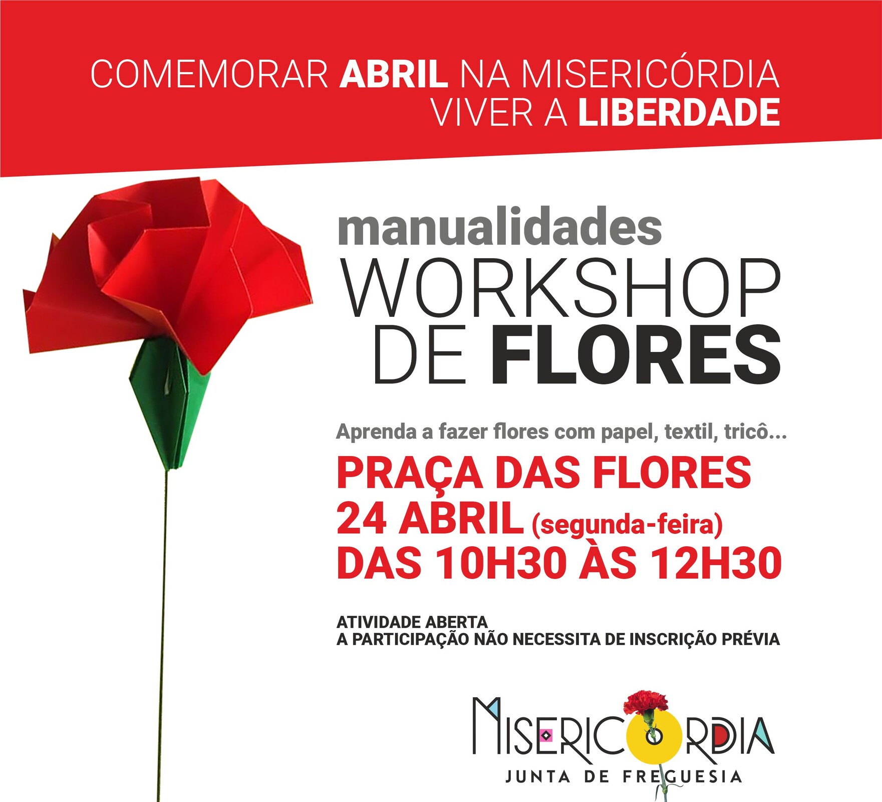 Inserido no programa de comemoração do 25 de Abril, a Junta de Freguesia da Misericórdia promove no próximo dia 24 de abril, entre as 10h30 e as 12h30, na Praça das Flores, um espaço para manualidades criativas com um Workshop de Flores.