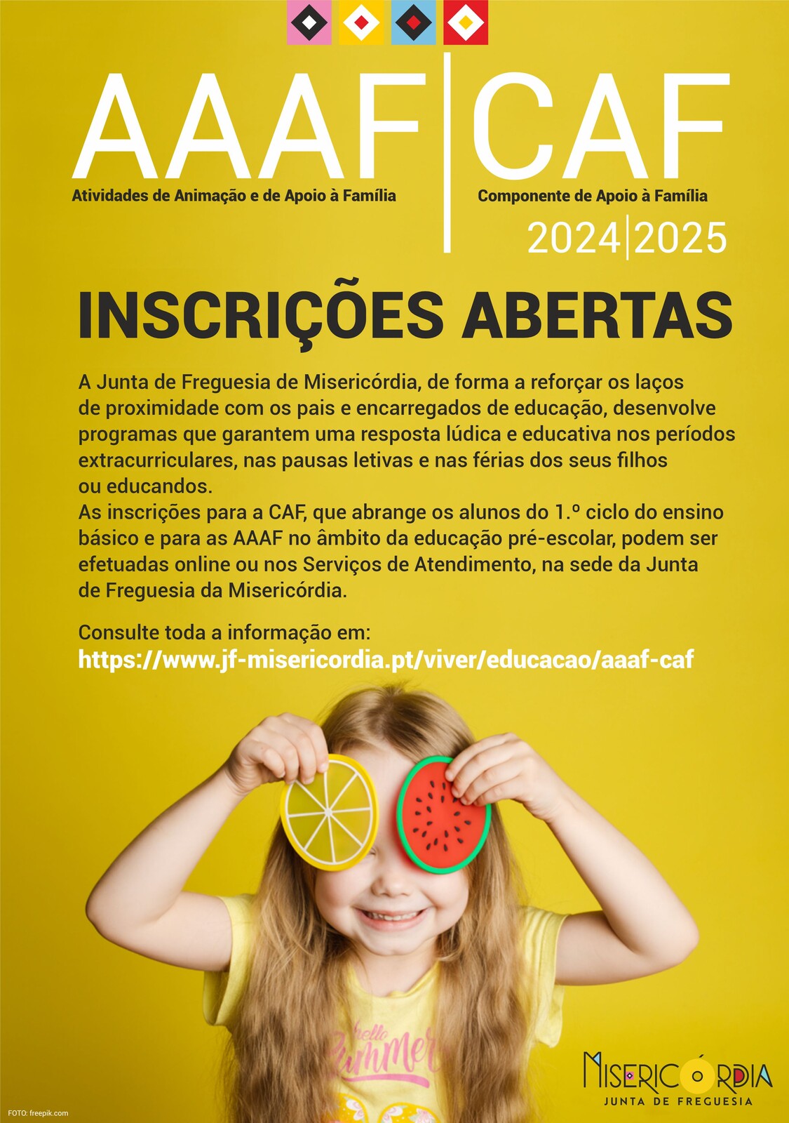 Desta forma, estão abertas as inscrições para a Componente de Apoio à Família (CAF), que abrange os alunos do 1.º ciclo do ensino básico e para as Atividades de Animação e de Apoio à Família (AAAF) no âmbito da educação pré-escolar, que podem ser efetuadas através de: https://forms.office.com/r/qhKQ45FphQ ou nos Serviços de Atendimento, na sede da Junta de Freguesia da Misericórdia.