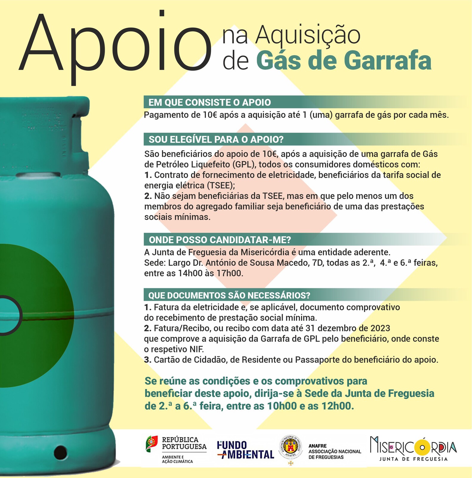 Está disponível o apoio de 10 euros por mês à compra de Gás de Petróleo Liquefeito (GPL) no limite de 1 garrafa por mês.