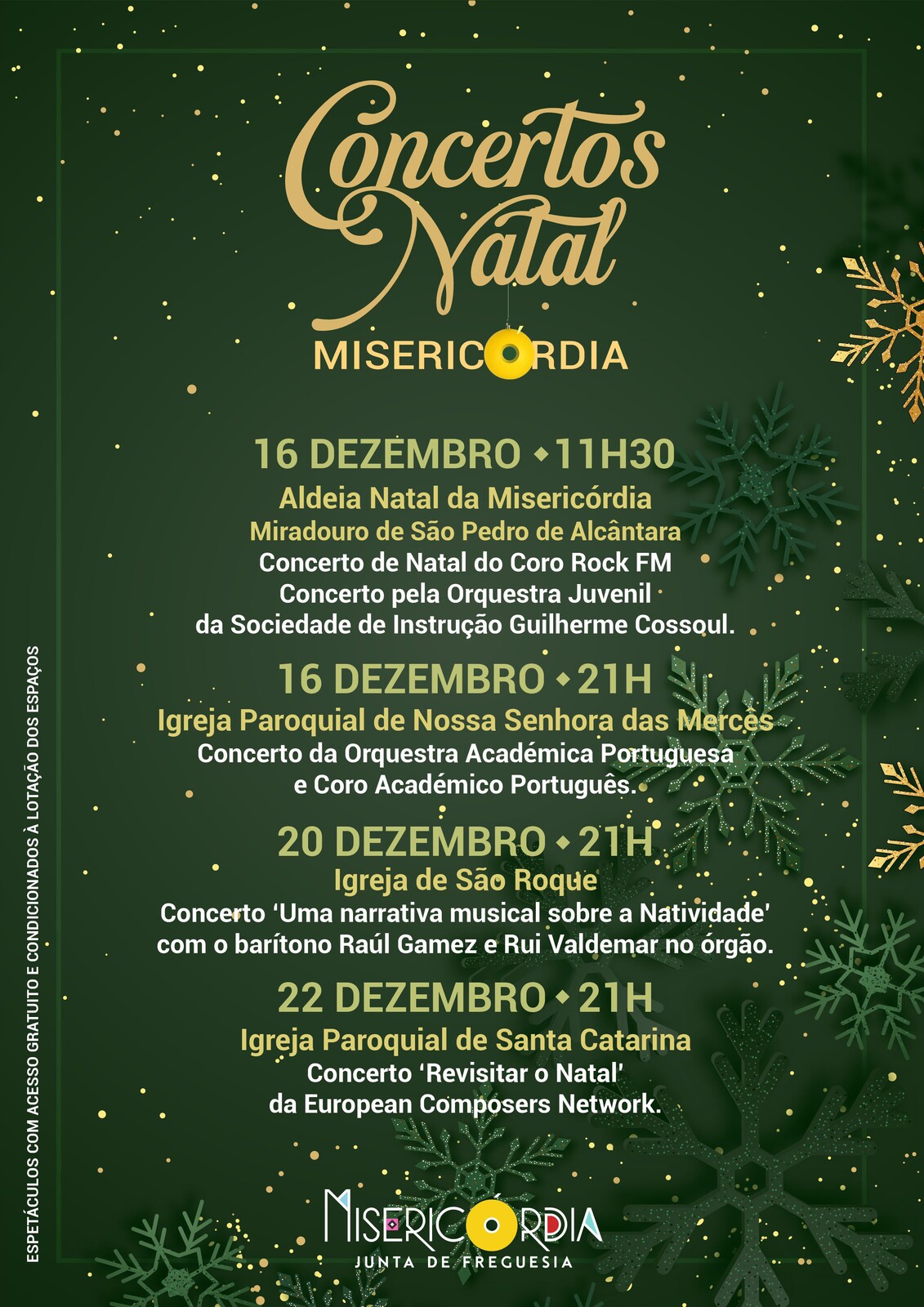Nos dias 16, 20 e 22 de dezembro, na Aldeia de Natal da Misericórdia (no Miradouro de São Pedro de Alcântara), na Igreja Paroquial de Nossa Senhora das Mercês, na Igreja de São Roque e na Igreja Paroquial de Santa Catarina, a Junta de Freguesia da Misericórdia proporciona a partilha da qualidade artística dos intérpretes, com o valioso património do nosso território.