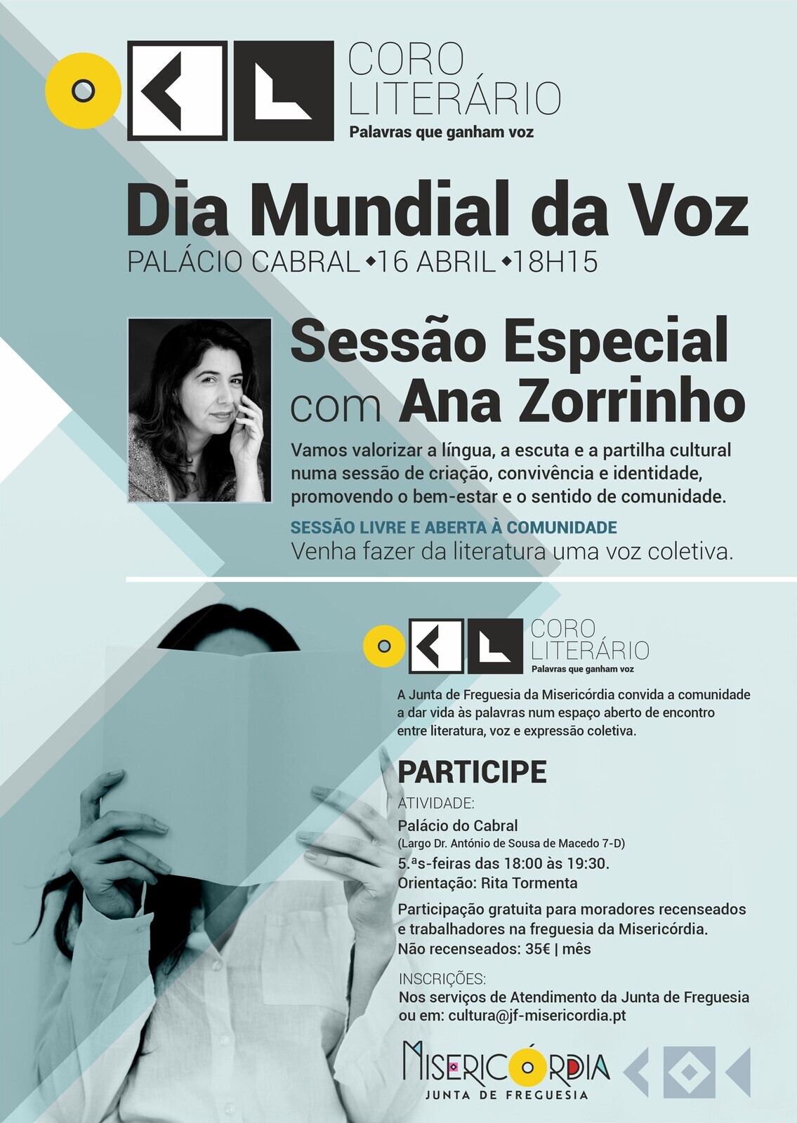No dia 16 de abril vamos celebrar o Dia Mundial da Voz. O Coro Literário da Misericórdia promove na sua habitual sessão de quinta-feira, um encontro aberto à comunidade com a convidada Ana Zorrinho, a partir das 18h15, no Palácio Cabral.