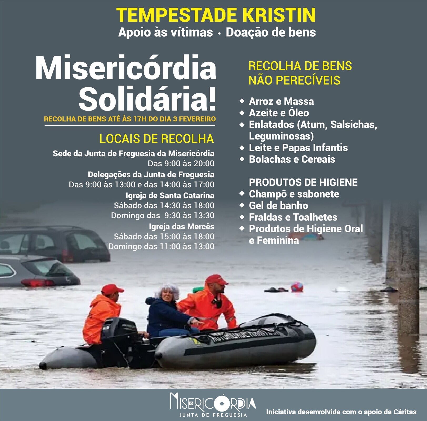 Face à necessidade urgente de bens alimentares não perecíveis e produtos de higiene, a Junta de Freguesia da Misericórdia promove uma campanha de angariação de bens para apoiar quem mais precisa.