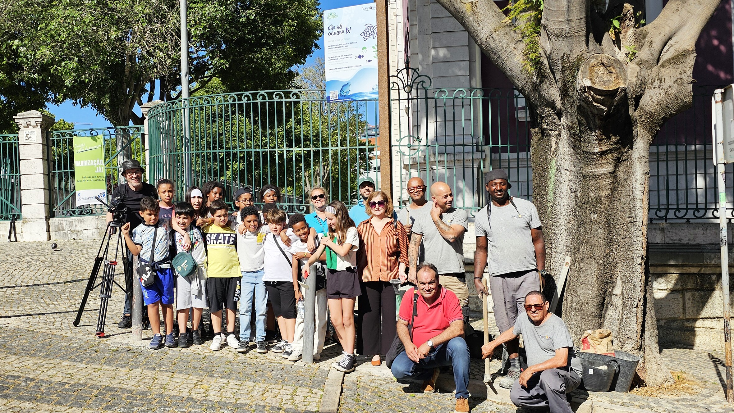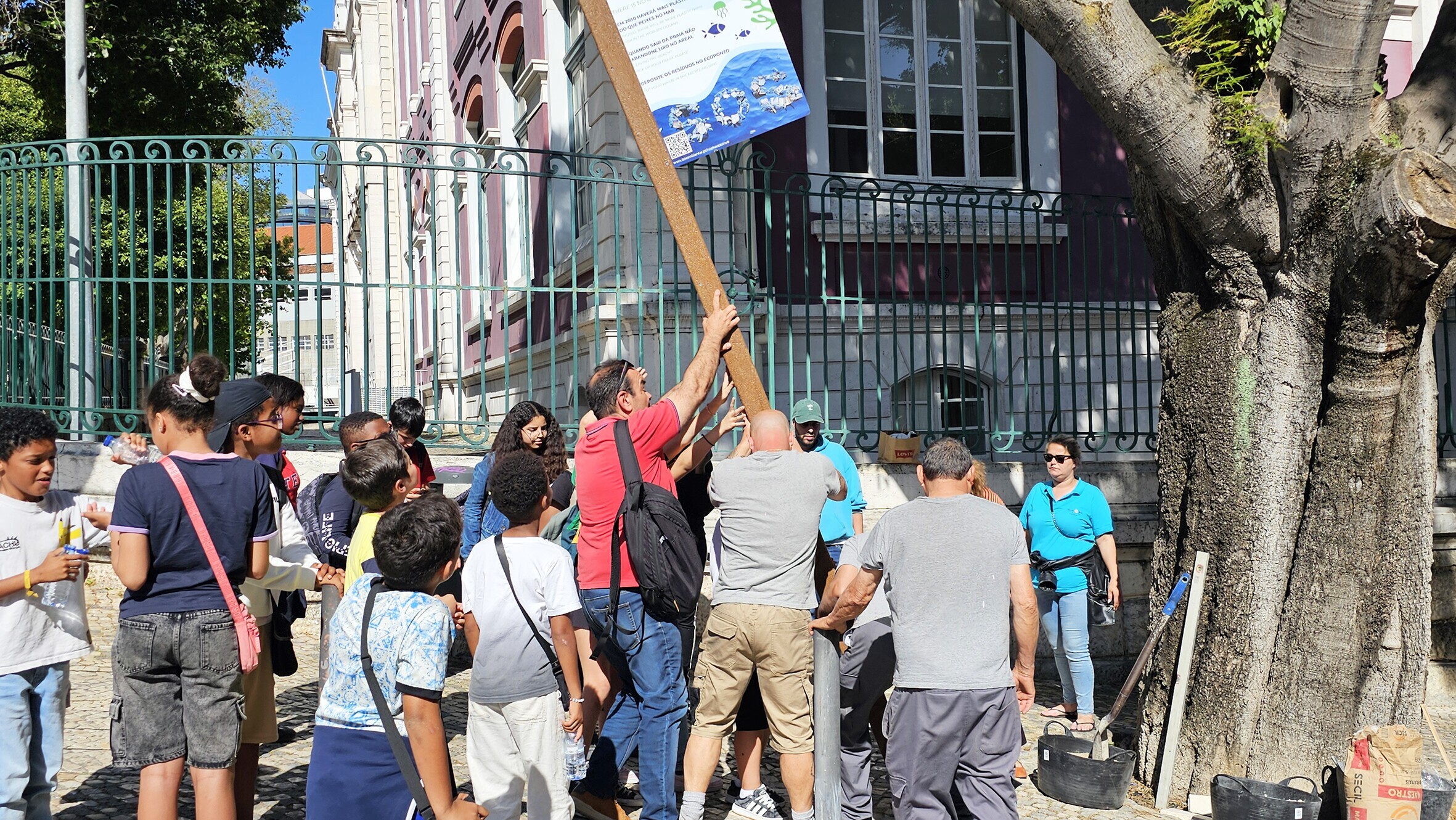 Após a ação de esclarecimento realizada no Palácio Cabral, os jovens do ‘Projeto Intervir’ participaram na colocação de um dos painéis de sensibilização para a relação casual entre o consumo de produtos descartáveis (particularmente de plástico) e a poluição dos ecossistemas marinhos, apelando à reciclagem e evitando que se tornem lixo.
