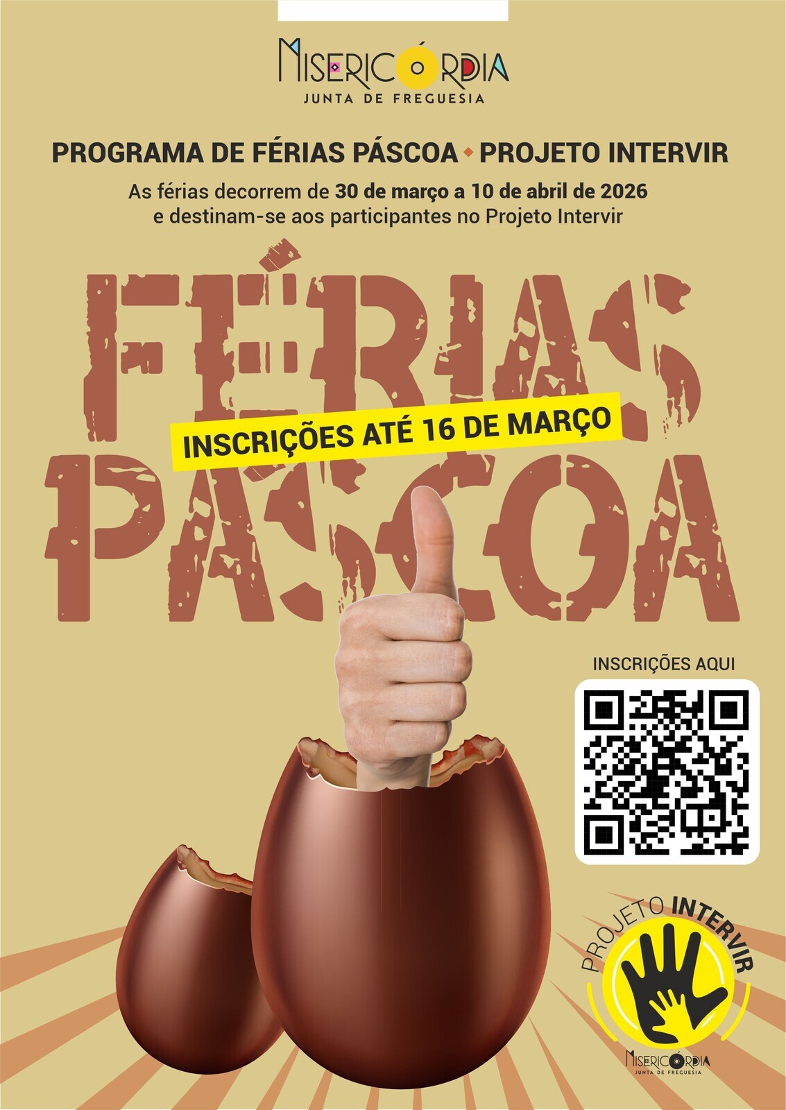 As Inscrições para o Programa das Férias da Páscoa do Projeto Intervir devem ser efetuadas até ao dia 16 de março através do preenchimento do formulário online disponível em: