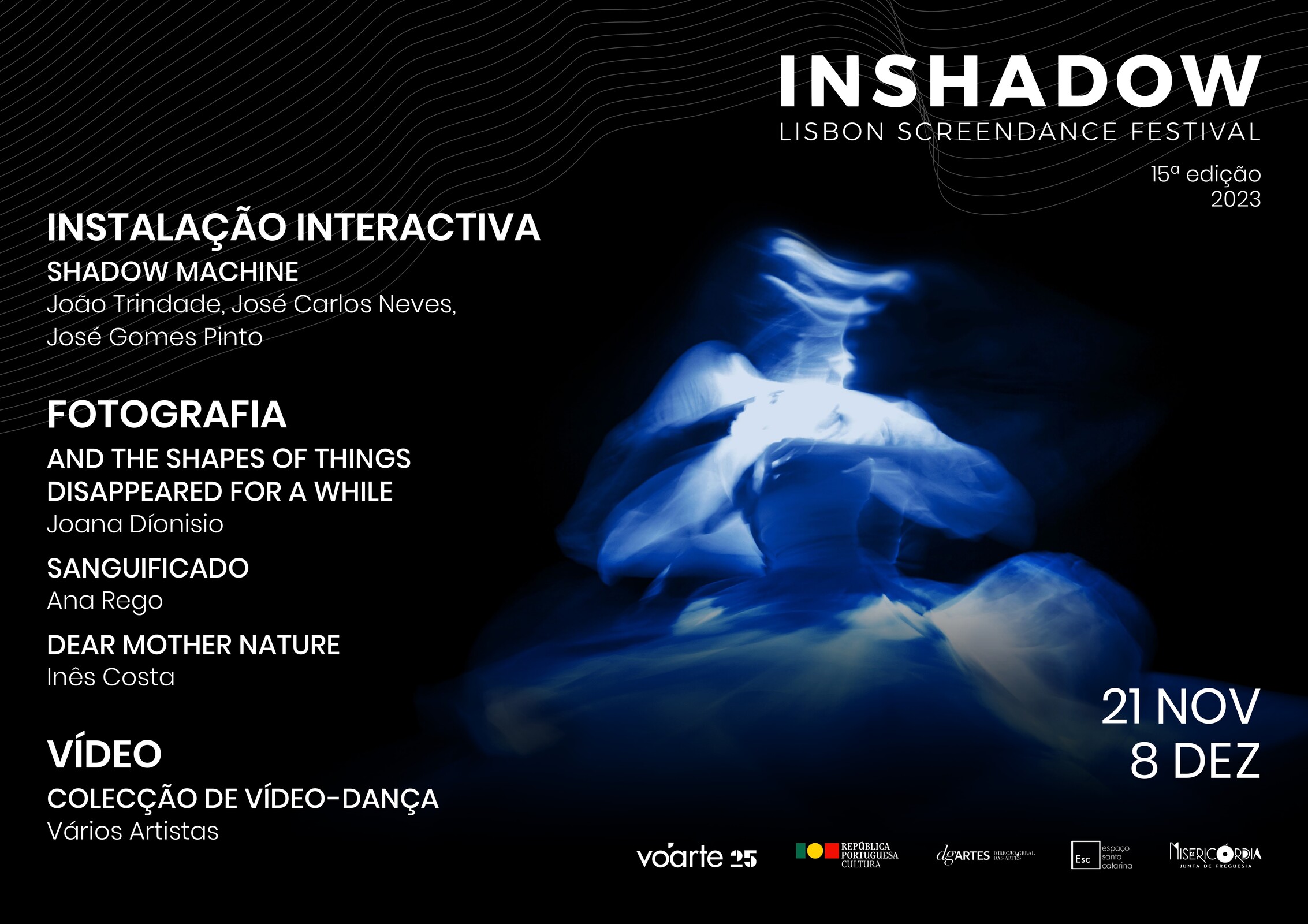 A Freguesia da Misericórdia acolhe, entre os dias 21 novembro a 15 dezembro, no Espaço Santa Catarina (Largo dr. António de Sousa Macedo, 7-D) e no Espaço Cultural Mercês (Rua Cecílio de Sousa, 94), exposições de fotografia, instalações interativas e instalações de vídeo-dança, inseridas na edição do Festival ‘Inshadow - Lisbon Screendance Festival 2023’.