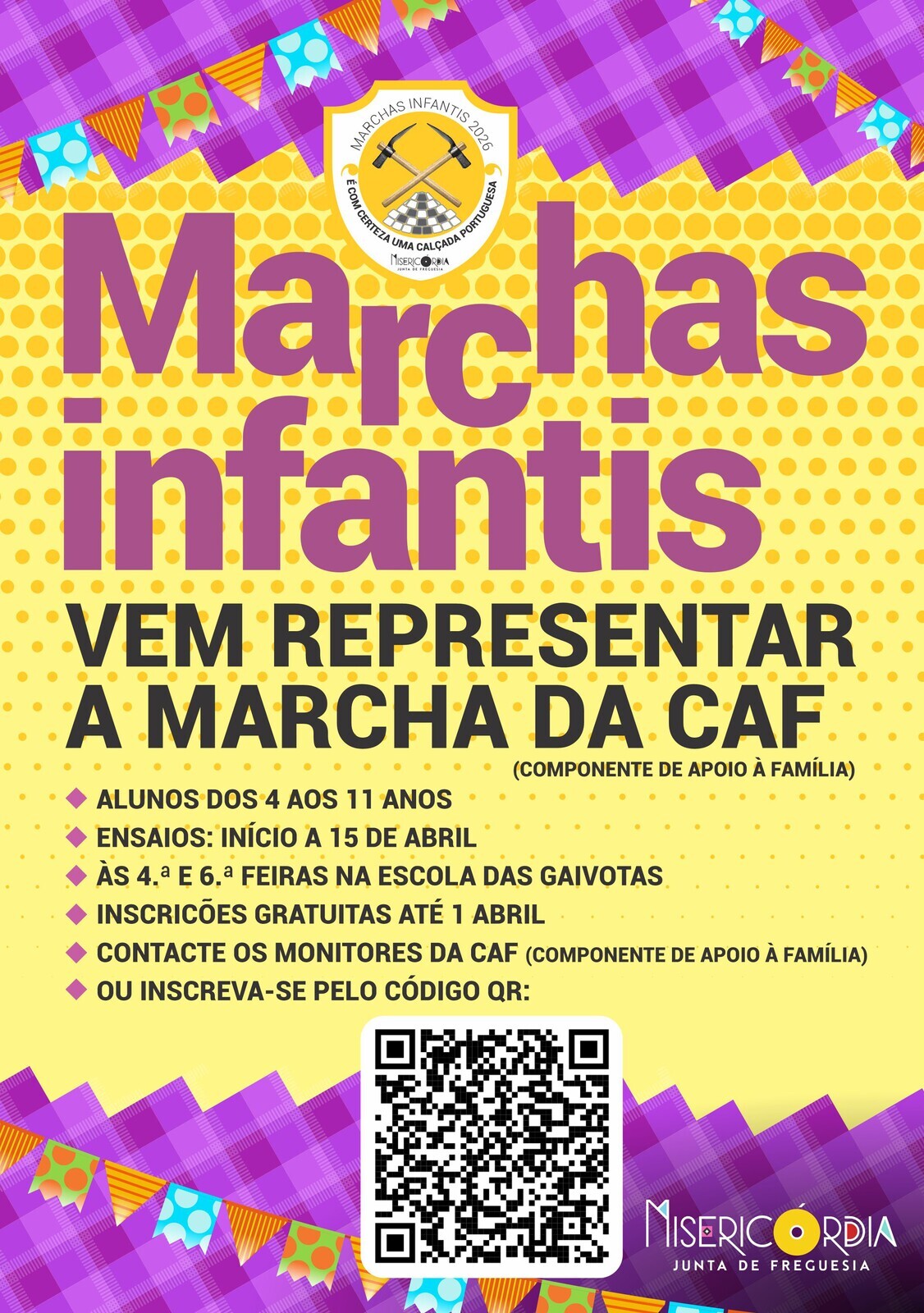 Até ao próximo dia 1 de abril, e procurando dar palco a mais jovens marchantes, a Junta de Freguesia da Misericórdia, através da Componente de Apoio à Família (CAF) das Escolas públicas da freguesia, desafia os jovens, dos 4 aos 11 anos de idade a participarem neste evento onde se misturam muita animação, cor, música e a promoção do conhecimento pelo património popular da freguesia e da cidade. Todos vão a tempo.