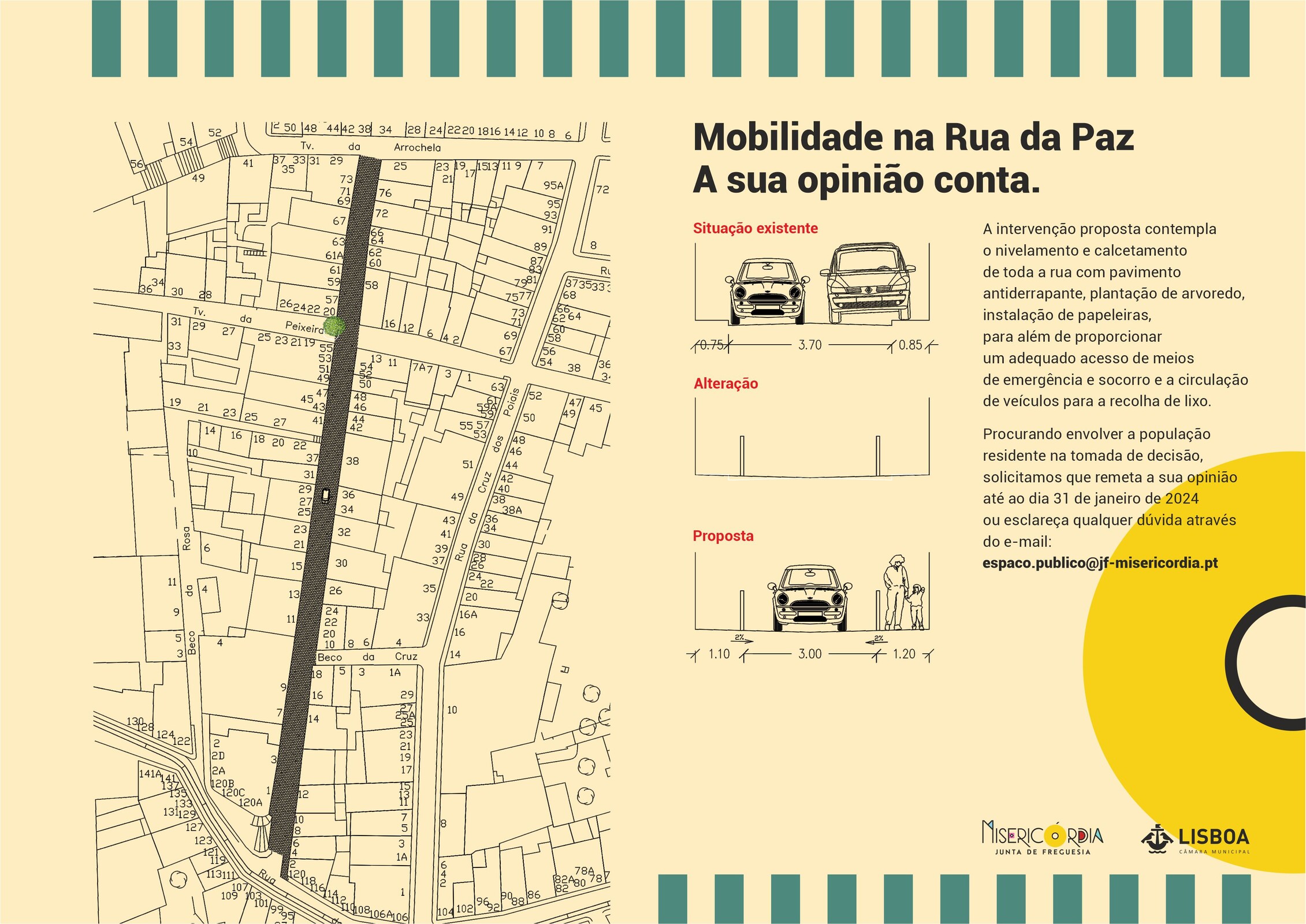 Procurando envolver a população residente na tomada de decisão, solicitamos que os moradores remetam a sua opinião ou esclarecimento de qualquer dúvida, até ao dia 31 de janeiro, através do e-mail: espaco.publico@jf-misericordia.pt