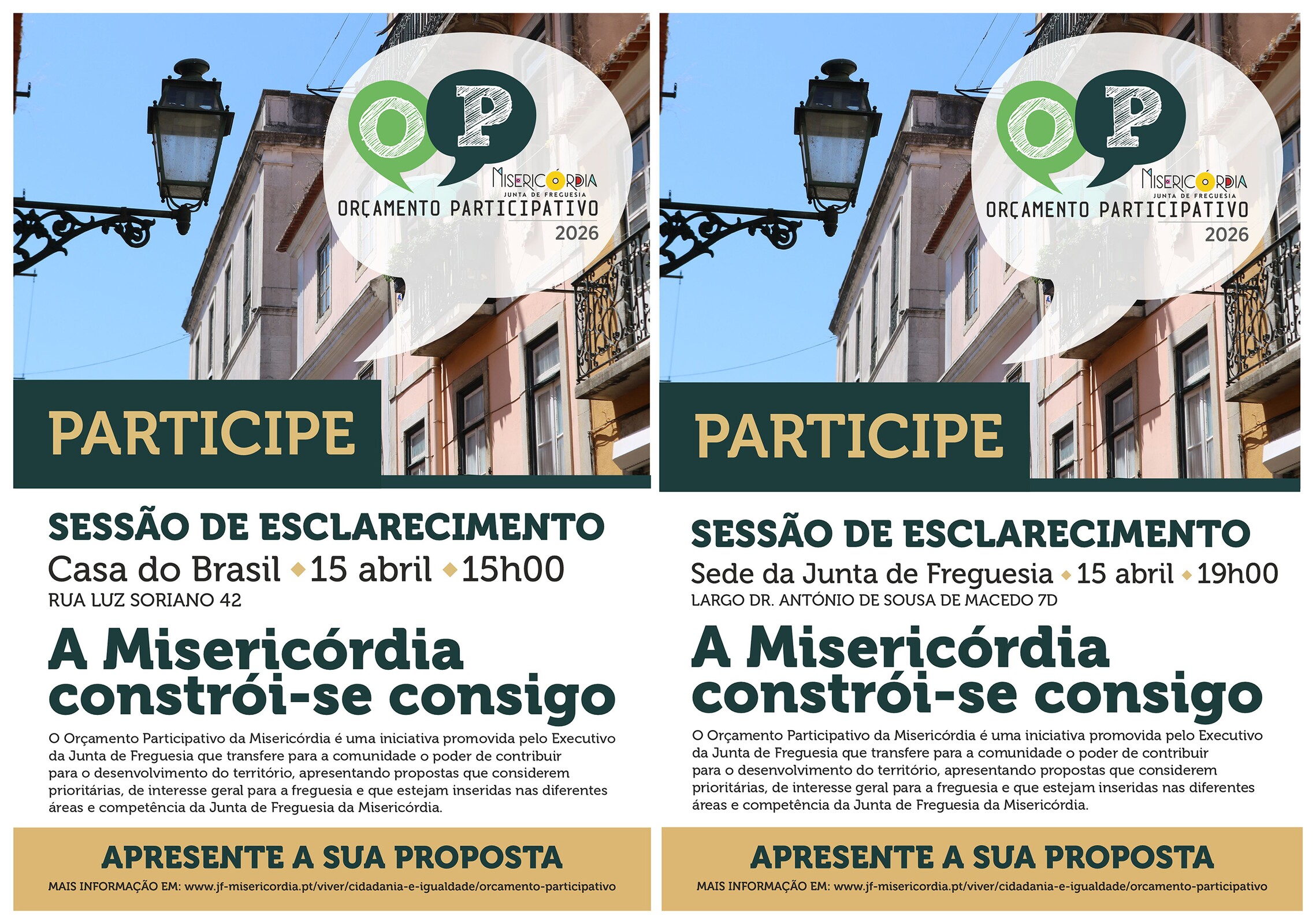 A Junta de Freguesia da Misericórdia promove, no dia 15 de abril, duas sessões de esclarecimento sobre o Orçamento Participativo da Misericórdia 2026.