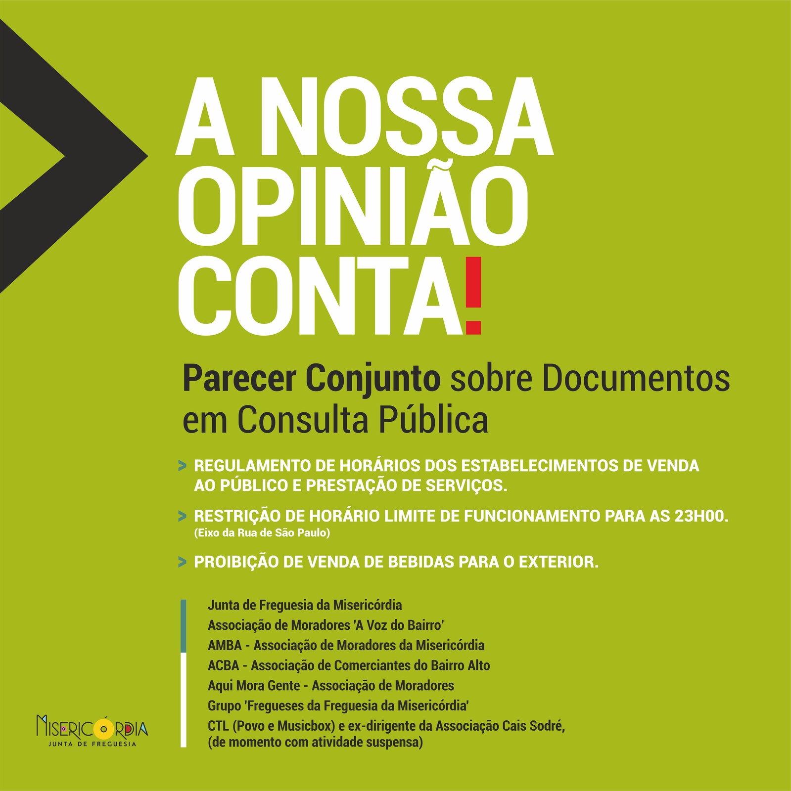 As entidades e cidadãos interessados, Junta de Freguesia da Misericórdia, a Associação de Moradores ‘A Voz do Bairro’, a AMBA - Associação de Moradores da Misericórdia, a ACBA - Associação de Comerciantes do Bairro Alto, a Aqui Mora Gente - Associação de Moradores, a CTL (Povo e Musicbox) e ex-dirigente da Associação Cais Sodré, de momento com atividade suspensa e o Grupo ‘Fregueses da Freguesia da Misericórdia’, no âmbito das consultas públicas, remeteram à Câmara Municipal de Lisboa, de acordo com os Avisos n.º 9, 10 e 11/2024, os pareceres conjuntos: