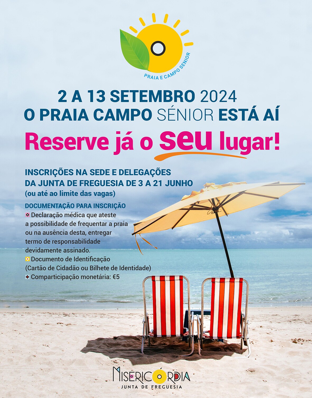 As inscrições para o Programa Praia Campo Sénior 2024 têm início no dia 3 de junho e decorrem até ao dia 21 na sede e nas delegações da Junta de Freguesia.