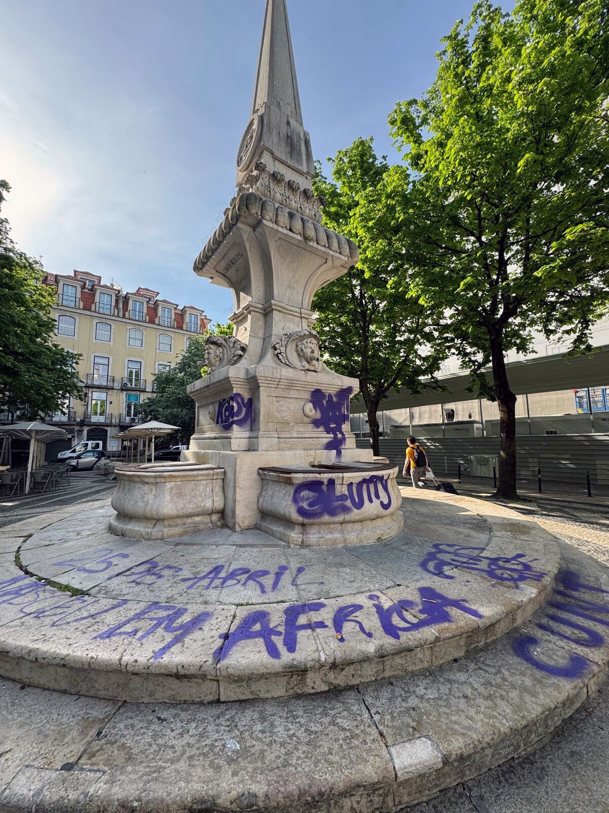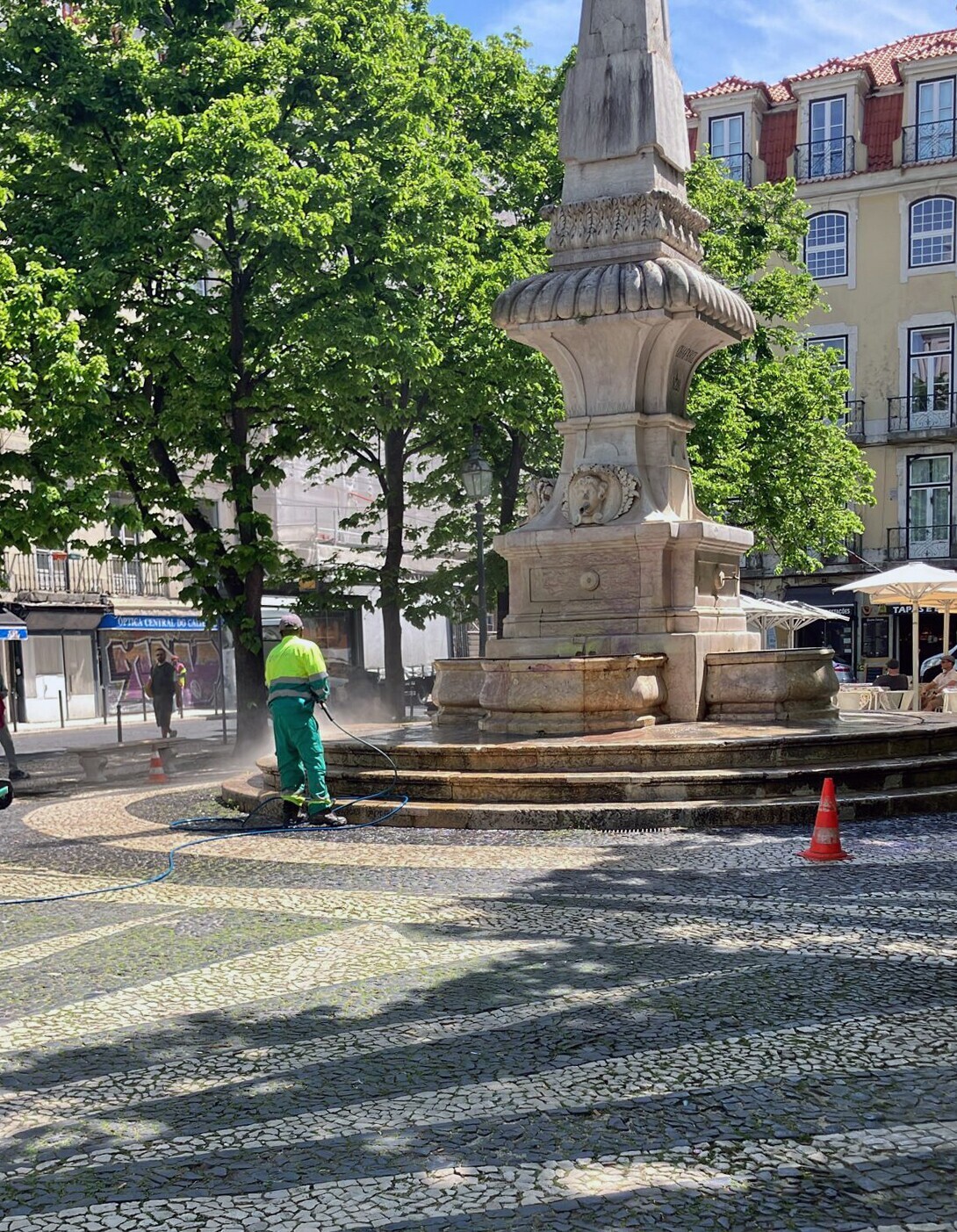Na manhã desta segunda-feira, também foi realizada uma operação de limpeza de ‘escrita de graffiti’ em alguns locais da freguesia com recurso a meios mecânicos. A imagem ilustra os trabalhos desenvolvidos pelas equipas da CML na Praça de S. Paulo, após a vandalização do Chafariz.