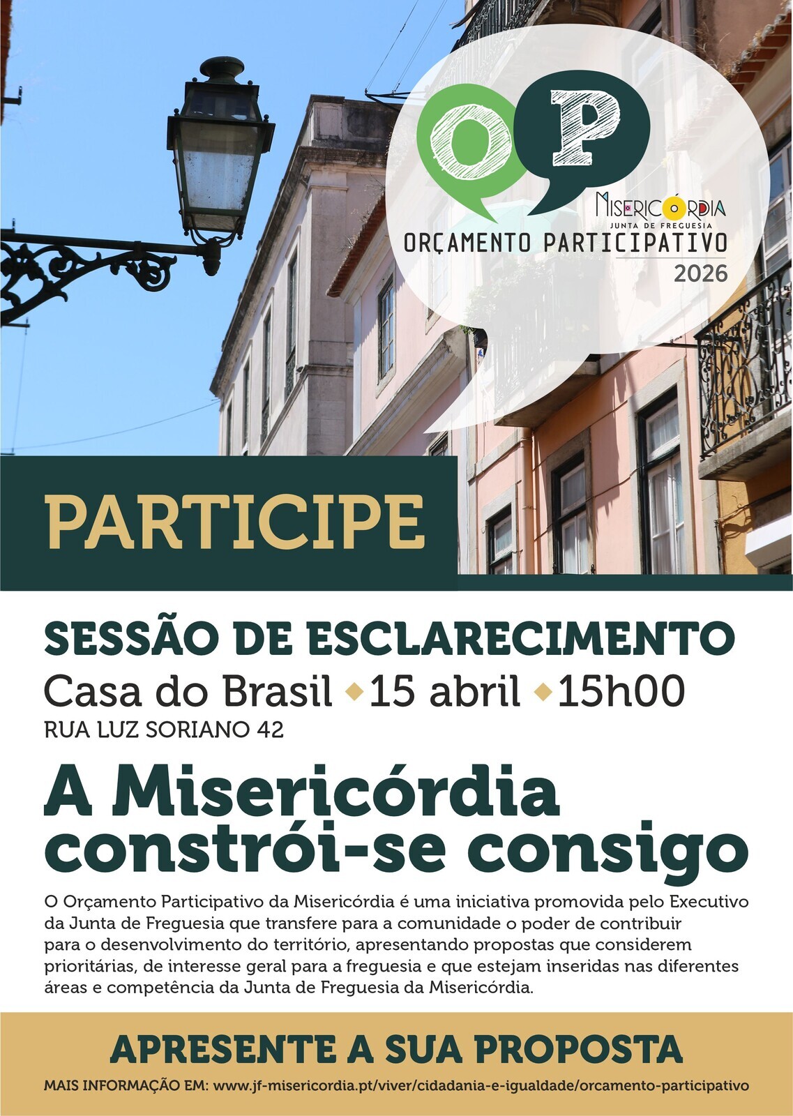 A Junta de Freguesia da Misericórdia promove, no dia 15 de abril, duas sessões de esclarecimento sobre o Orçamento Participativo da Misericórdia 2026.